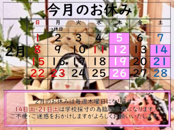 14日㈯・21日㈯は学校採寸の為臨時休業となります。